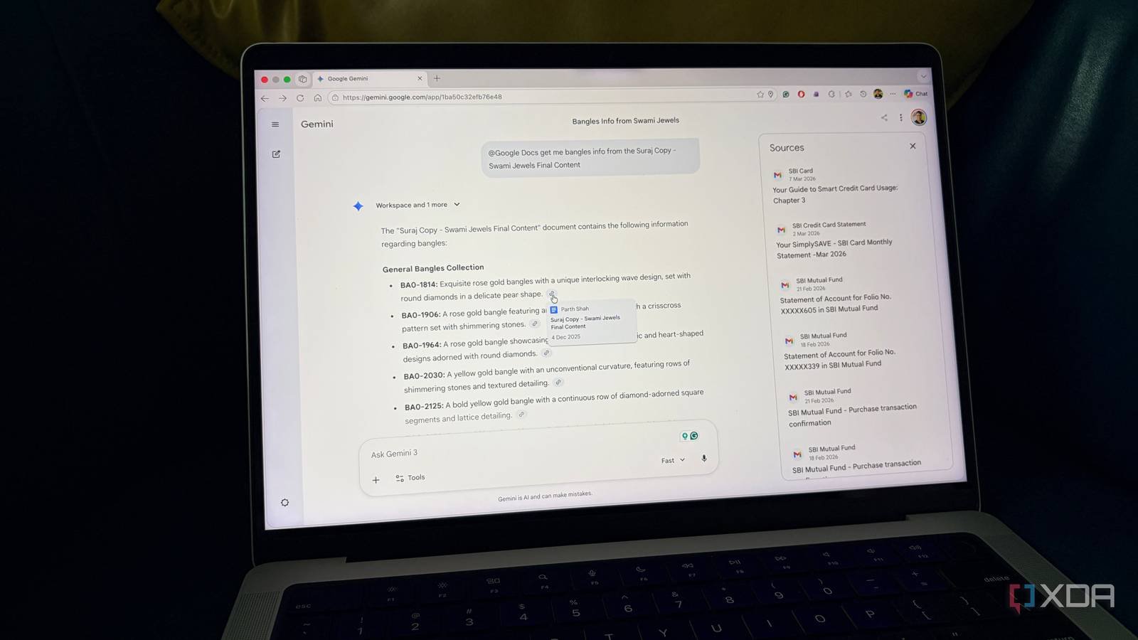 For example, I can launch Gemini and type ‘Get me bracelets from @Google Docs Suraj Copy – Swami Jewels Final Content’ and get the code name and description for each product. I don’t even need to open and find the information from that file.